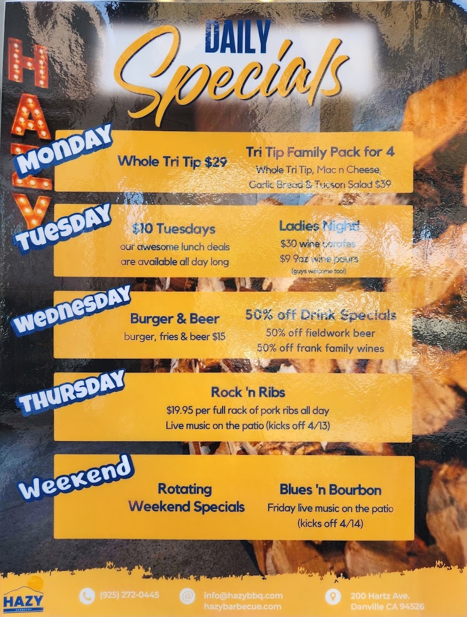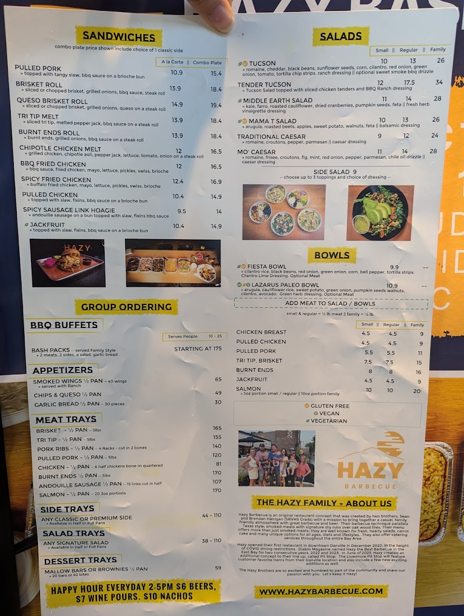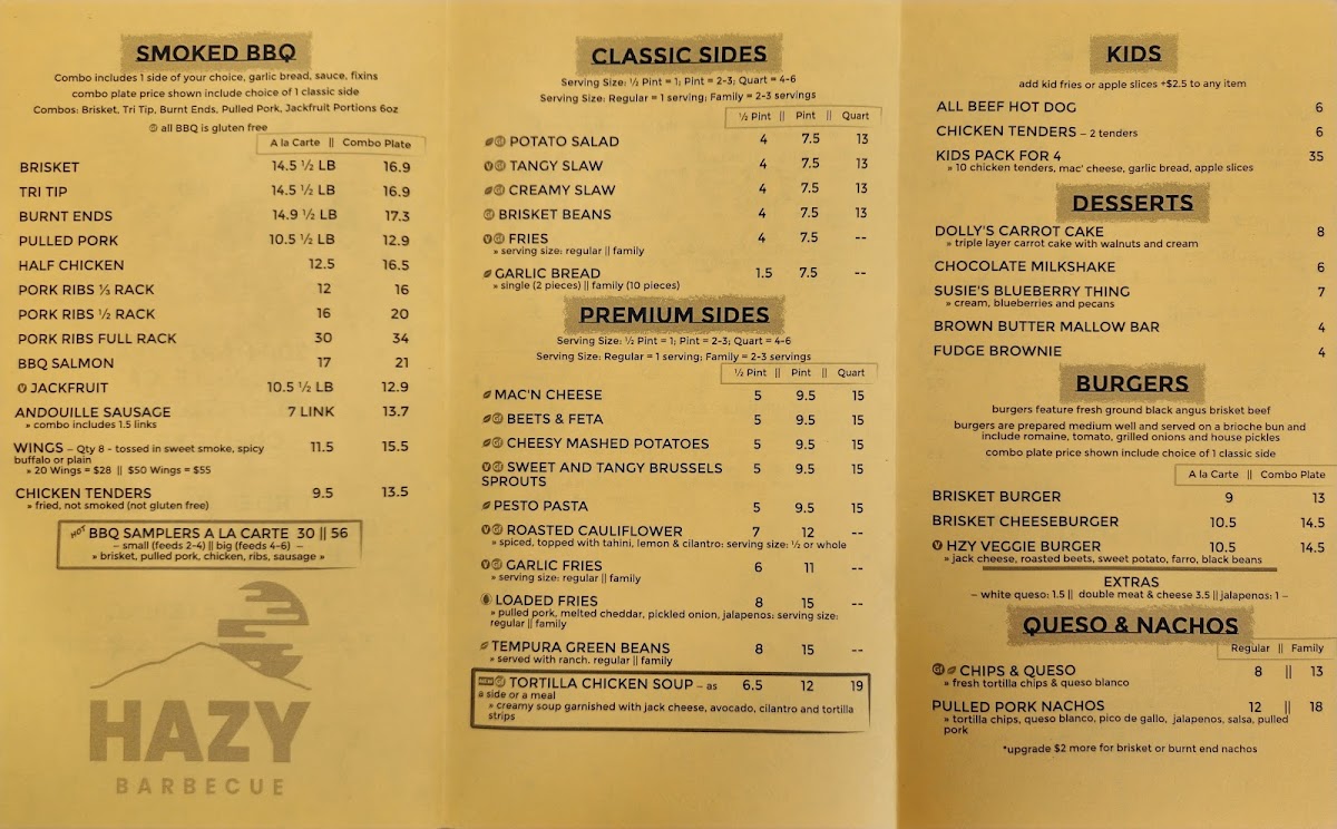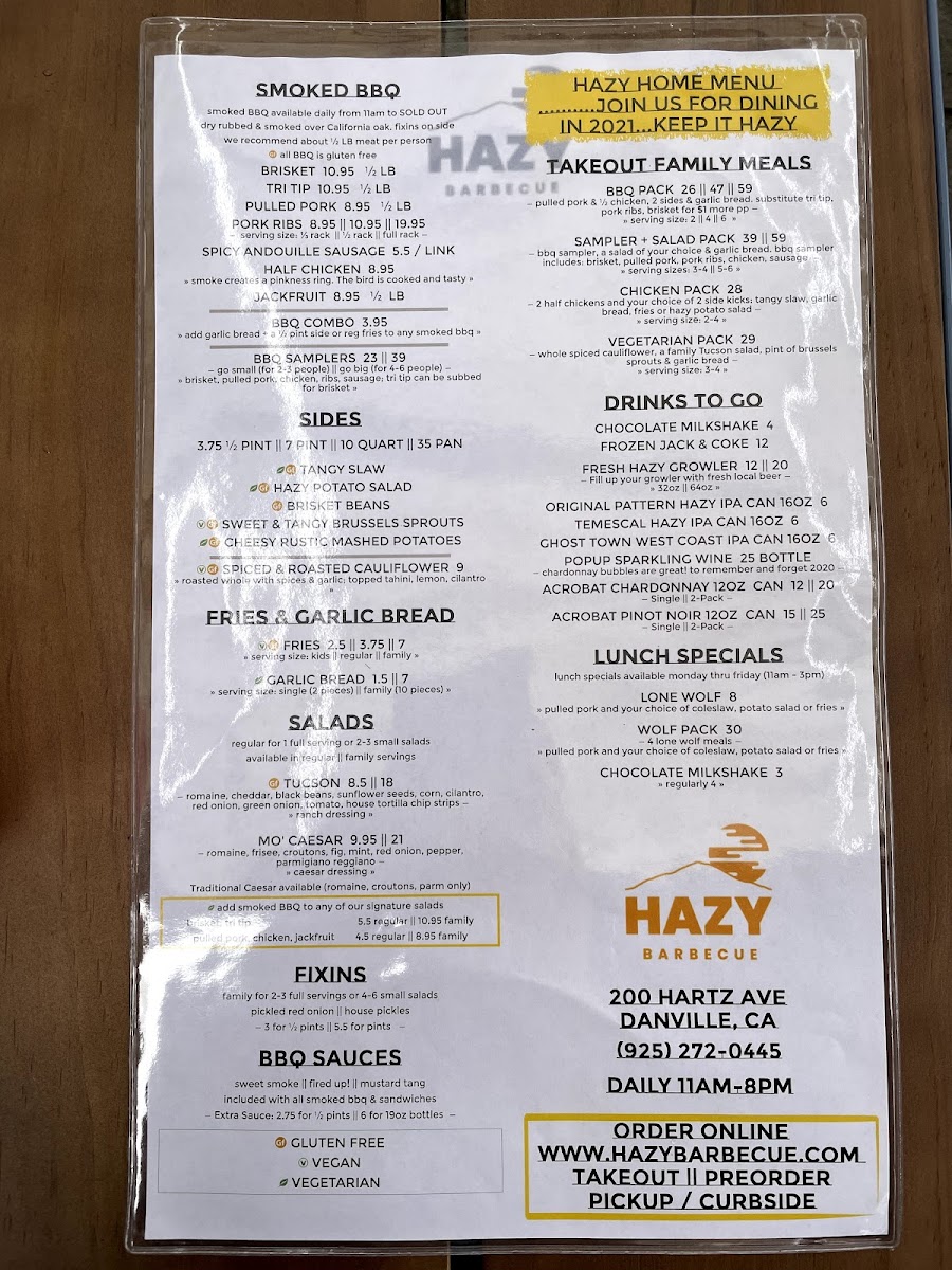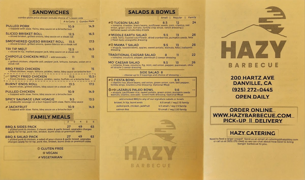 If you’re craving a hearty, flavorful barbecue meal, look no further than Hazy Barbecue Menu. Located at 200 Hartz Ave in Danville, CA, this spot is all about bringing rich, smoky flavors to the table. Whether you're in the mood for tender ribs, juicy pulled pork, or a perfectly charred brisket, there's something to satisfy every craving. Each dish is cooked to perfection, offering an unforgettable combination of spices and wood-fired goodness. Dive into the sides, from creamy mac and cheese to tangy coleslaw, all designed to complement the main dishes. With a laid-back atmosphere and mouthwatering offerings, Hazy Barbecue ensures every meal is a celebration of flavors you won’t want to miss.
